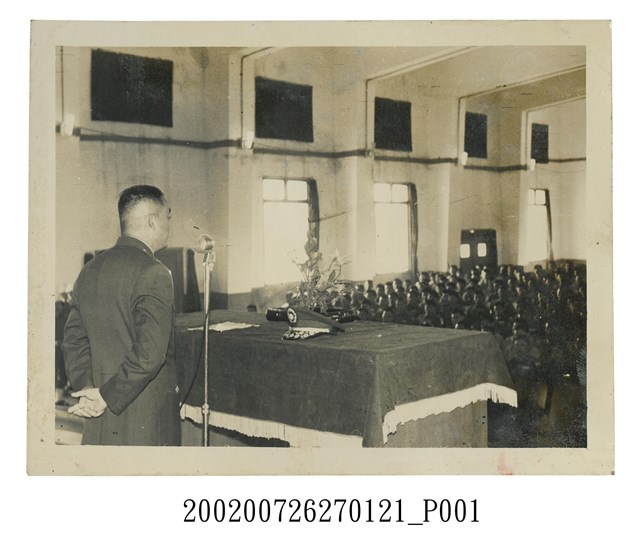 1.本文物為彭啟超指揮官於青年節慶祝大會訓話照片,黑白樣式,照片中可見彭啟超於講臺上,臺下有諸多聽眾,彭啟超身穿軍外套,雙手擺於腰後,正在利用直立式麥克風訓話,前方有1講桌,上放有其軍帽及1盆盆栽,場所位於室內。