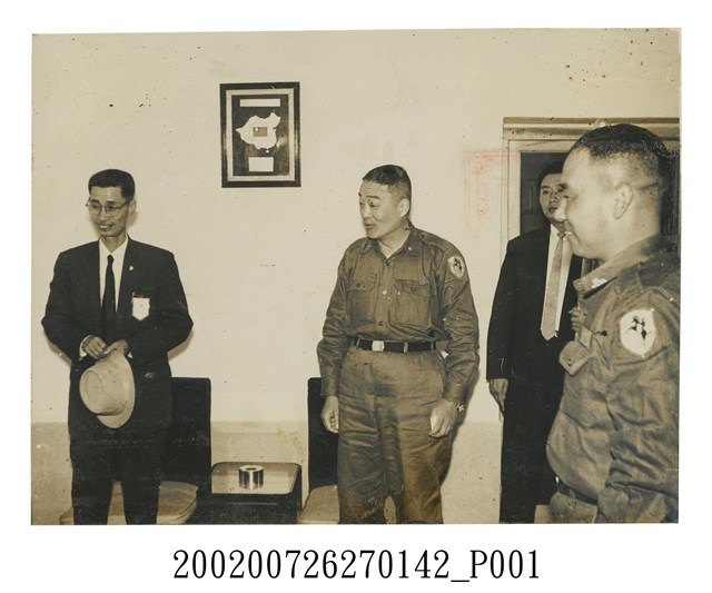 1.本文物為彭啟超指揮官接見嘉義勞軍團與巍巍康樂隊照片,黑白樣式,照片中可見4名男子,其中右1與左2身穿軍服,左1與右2身穿黑西裝套裝,左2為彭啟超,左1手拿有1頂帽子,2人後方各有1張椅子,旁有小桌,場所位於室內。