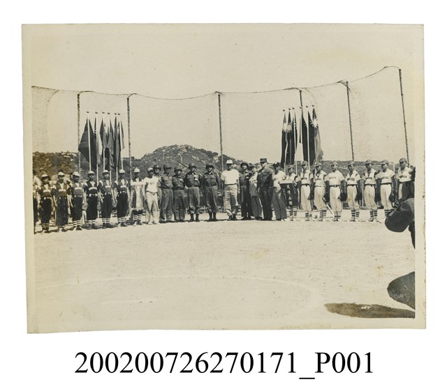 1.本文物為彭啟超指揮官主持馬祖中學棒球開球典禮照片,黑白樣式,照片中可見非常多人於球場中合照,於拍照隊伍兩側應為即將對戰之隊伍,畫面右側隊伍球衣為白色,畫面左側隊伍球衣為黑色,於畫面中央有4名身穿軍服,頭戴鋼盔之官兵,其中右1為彭啟超,佩戴墨鏡,畫面後方兩側各有6支直立式國旗,更後方有球場護網,場所位於棒球場。