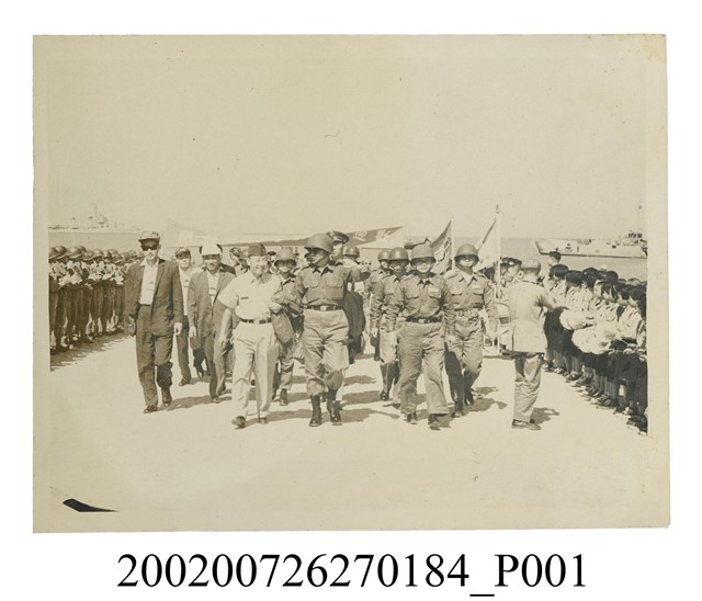 1.本文物為歡迎中外記者訪問馬祖照片,黑白樣式,照片中可見相當多人,其中大部分為官兵,皆身穿軍服,頭戴鋼盔,畫面兩側有列隊歡迎之隊伍,畫面中央帶隊者,為彭啟超指揮官,後方有人舉起長條形布幕,場所為於港澳邊。