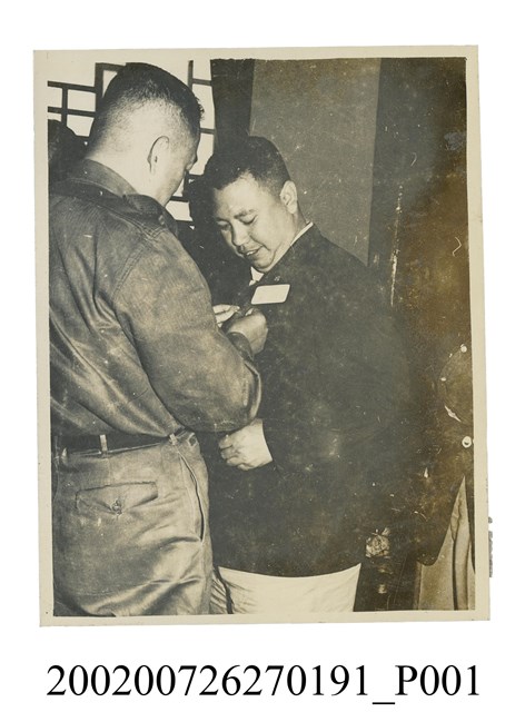 1.本文物為彭啟超指揮官替中外記者佩戴紀念章照片,黑白樣式,照片中可見2名男子,右者應為記者,身穿黑色外套,正在接受左者為其別以紀念章,左者為彭啟超,身穿軍服,正在為右者佩戴紀念章,場所位於室內。