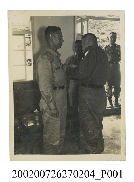 1.本文物為雷鳴演習之彭啟超指揮官替人佩戴紀念章照片,黑白樣式,照片中可見4名官兵,皆身穿軍服,右2為彭啟超,正在為左1佩戴紀念章,左1應為美軍顧問,正在接受彭啟超為其別以紀念章,場所位於室內。