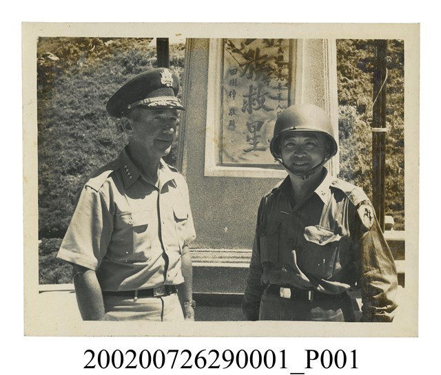 1.本物件為黑白照片,為美太平洋陸軍總司令柯林頓上將蒞臨馬祖訪問的情景。由照片可見拍攝地點為戶外,身著長袖深色軍服、頭戴鋼盔的馬祖守備區指揮部彭啟超(右)與身著淺色短袖軍服、頭戴軍帽的柯林頓上將(左)一同進行半身合影。合影背景有一座標語,可見上方以漢字書寫「中華民國四十九年軍人節」、「族救星」(註:應為民族救星,「民」字恰好未入鏡)、「田樹樟敬題」。