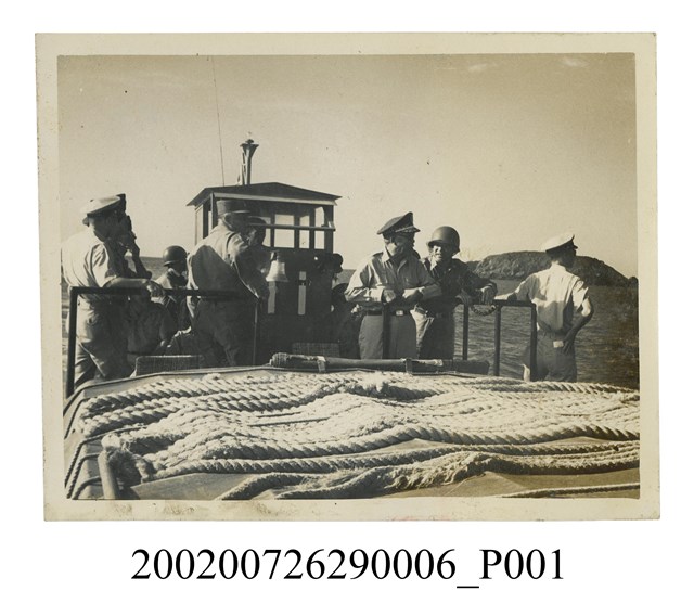 1.本物件為黑白照片,為美太平洋陸軍總司令柯林頓上將蒞臨馬祖訪問的情景。由照片可見拍攝地點為一艘正在航行的船上,數位軍官聚集在船上一處,右一身著淺色短袖軍服、頭戴軍帽的軍人正往照片右方看去。右二身著深色軍服、頭戴鋼盔的軍人正在和身著淺色長袖軍服、頭戴軍帽的軍人一同靠在深色船桅對話。左方幾位軍人則站立在一旁。近景為排列整齊的粗麻繩,遠景為島嶼。