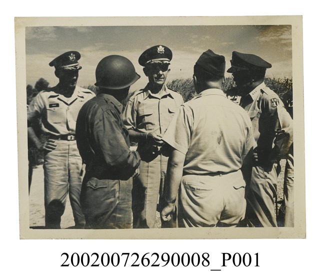 1.本物件為黑白照片,為美太平洋陸軍總司令柯林頓上將蒞臨馬祖訪問的情景。由照片可見共有五位軍人入鏡,左一、左三面對鏡頭者,為身著淺色短袖軍服、頭戴軍帽的外國軍官,左三為柯林頓上將。左二、右一、右二皆背對鏡頭,左一身穿深色長袖軍服、頭戴鋼盔,右一身著淺色長袖軍服、頭戴軍帽,右二身著淺色短袖軍服、頭戴軍帽。