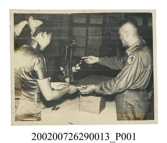 1.本物件為黑白照片,為馬祖守備區擴大慶生會的情景。由照片可見拍攝地點為室內,左方為一名身著短袖連身旗袍、頭上綁有髮飾的女性,正在遞物品給右方身著長袖軍服的馬祖指揮部彭啟超指揮官。兩人之間設有一張桌子,桌上放置一座花飾、一個箱子,桌前設有麥克風。