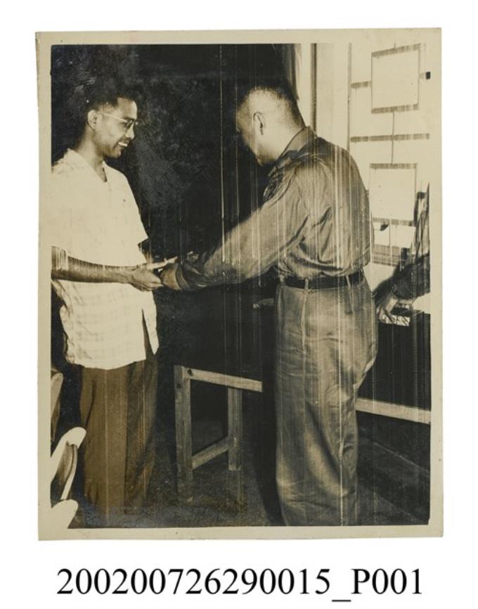 1.本物件為黑白照片,為馬祖守備區九一記者節的情景。由照片可見拍攝地點為室內,共有兩人入鏡。照片右方為深著長袖軍服的馬祖指揮部彭啟超指揮官將物品遞給左方深著白色短袖襯衫、長褲、戴著眼鏡的男性。照片右下方有一張桌子。