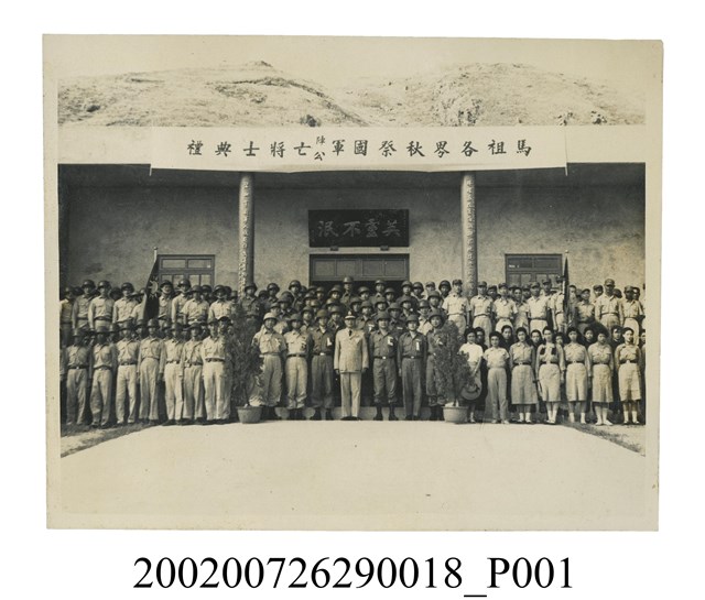 1.本物件為黑白照片,為馬祖各界秋祭國軍陣亡、公亡將士典禮合影的情景。由照片可見合影地點為南竿島珠螺村軍人公墓,一座建築物的前方。建築物上方懸掛一面布條「馬祖各界秋祭國軍陣亡公亡將士典禮」,牆面懸掛「英靈不泯」的深色牌匾。以建築物兩柱子為界,中間應為官階較高的軍人,左方多為身著淺色軍服、頭戴鋼盔的軍人,右方第一排為穿著淺色統一制服、白襪的女性,右方後排為穿著淺色軍服的軍人。