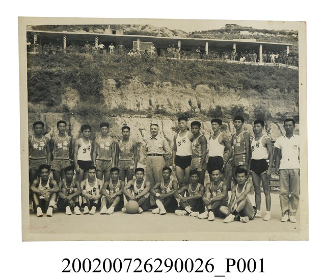 1.本物件為黑白照片,為馬祖指揮部彭啟超指揮官及籃球賽事參賽者合影的情景。由照片可見拍攝地點為梅石文康中心,合影者共有兩排。第一排皆為身著無袖球衣的球員,雙手交叉放置於雙腳前坐在地板上,左五球員前方放置一顆籃球。第二排則統一呈現站姿,左六為身著長袖軍服的彭指揮官,其餘皆為身著無袖球衣的球員,惟右一男性身著白色有領短袖上衣、長褲。