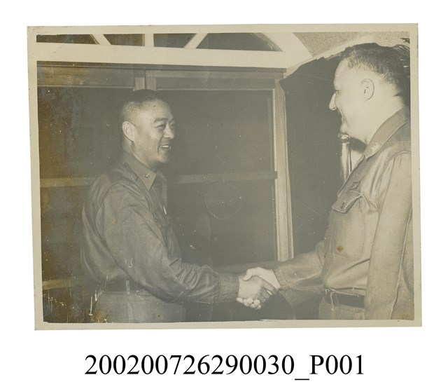 1.本物件為黑白照片,為馬祖指揮部彭啟超指揮官與美軍顧問握手合影的情景。由照片可見拍攝地點為室內,照片左方為身著深色長袖軍服彭指揮官,站在一扇門旁,正面帶微笑與照片右方身著長袖軍服的美軍顧問握手。