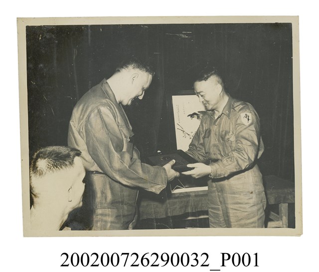 1.本物件為黑白照片,為馬祖指揮部彭啟超指揮官致贈紀念品予美軍顧問的情景。由照片可見拍攝地點為室內,共有三人入鏡。照片右方身著長袖軍服、左袖繡有指揮部徽章的彭指揮官,正在遞贈紀念品予照片左方身著長袖軍服的美軍顧問。照片左下角有一名軍官的頭部入鏡。