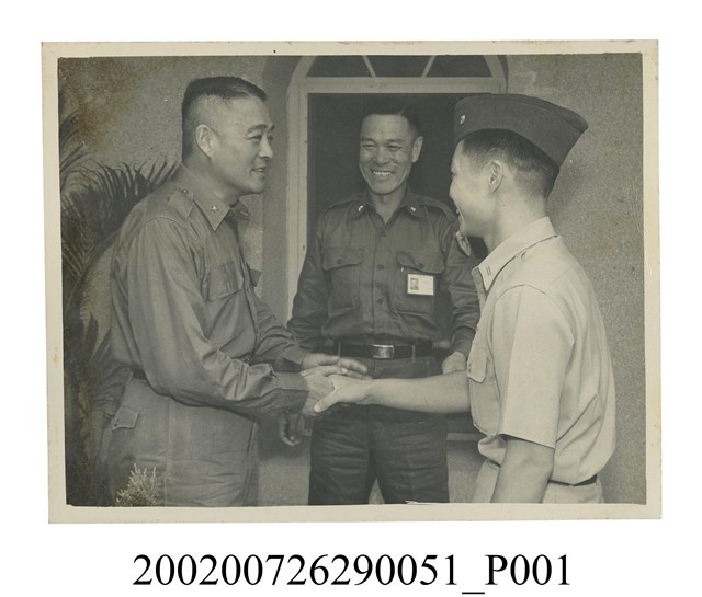 1.本物件為黑白照片,為馬祖守備區彭啟超指揮官接見反共義士的情景。由照片可見共有三人入鏡,身著長袖軍服的彭指揮官正在與照片右方身著淺色短袖軍服、頭戴軍帽的反共義士劉承司握手。兩者之間的後方,有一名身著長袖軍服、左胸前佩戴識別證的軍人面帶微笑的望向彭指揮官。