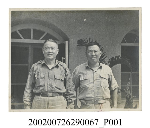1.本物件為黑白照片,為馬祖守備區彭啟超指揮官與一名軍人合影的情景。由照片可見拍攝地點為戶外,一棟建築物旁。照片右方為身著淺色短袖軍服的軍人,照片左方身著深色長袖軍服者為彭指揮官。