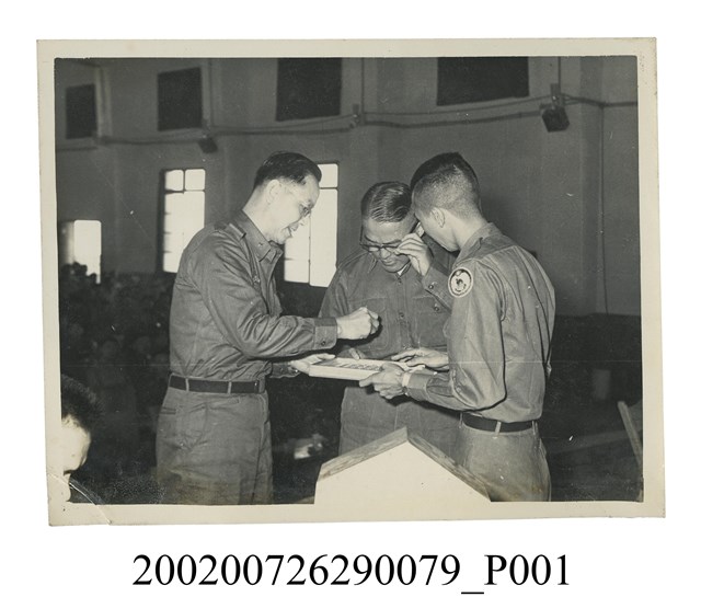 1.本物件為黑白照片,為馬祖指揮部彭啟超指揮官與另外兩名軍人正在看獎球的情景。由照片可見拍攝地點為室內,三位正在臺上看著以木盒盛裝的彩球。身著長袖軍服的彭指揮官位於中間,左手推著眼鏡望向彩球,兩邊各一位身著長袖軍服的軍人協助彭指揮官。遠景為臺下的軍人。