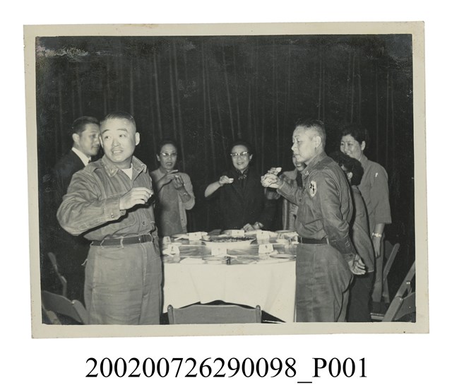 1.本物件為黑白照片,為馬祖指揮部彭啟超指揮官設宴歡迎中華婦女各界勞軍團的情景。由照片可見拍攝地點為室內,設有深色布簾。彭指揮官與其他長官、勞軍團代表等,約有八人一同圍坐一圓桌,桌上設有菜餚以及碗筷。左二為身著長袖軍服的彭指揮官正面向鏡頭。其餘七人皆呈現站立的姿勢,手持酒杯一同敬酒。