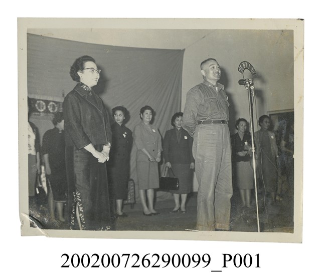 1.本物件為黑白照片,為馬祖指揮部彭啟超指揮官介紹中華婦女各界勞軍團的代表的情景。由照片可見拍攝地點為室內,照片右方身著長袖軍服的彭指揮官正在對著一座「馬祖廣播電台」麥克風發言。照片左方彭指揮官身旁站立一位身著深色外套、深色連身旗袍、佩戴眼鏡的短髮女性,將雙手交叉於腹部前方。兩位的後方站立一排身著深淺不一套裝的女性。