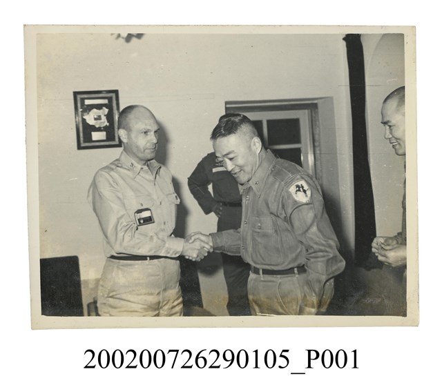 1.本物件為黑白照片,為馬祖指揮部彭啟超指揮官與美軍顧問團助理參謀長華德上校握手的情景。由照片可見拍攝地點為室內,牆上有一個裱框的物品。照片右側身著深色長袖軍服者為彭指揮官,正在和照片左側身著淺色長袖軍服的華德上校握手。