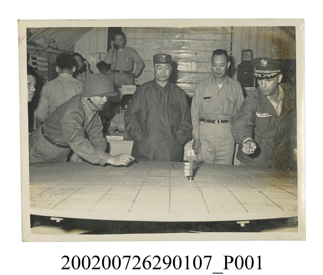 1.本物件為黑白照片,為美軍顧問團助理參謀長華德上校參觀作戰中心的情景。由照片可見拍攝地點為室內,照片右一身著深色長袖軍服者為華德上校,照片左一身著深色長袖軍服、頭戴鋼盔者為馬祖指揮部彭啟超指揮官,正在為華德上校講解作戰地圖。兩位的後方站有一名身著深色軍服、頭戴軍帽的軍人、一名身著淺色軍服的軍人。照片左上方有一名軍人正在打電話。