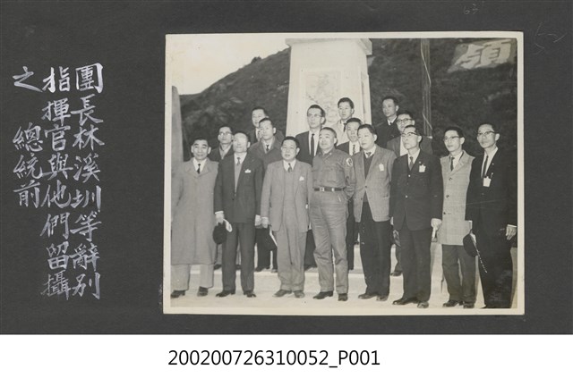 1.本物件以馬祖戰地為主題的照片,黑白樣式。照片為馬祖守備區彭啟超指揮官與勞軍團長辭別,與其他長官合影的情景。由照片可見拍攝地點為雲台山莊總統銅像前,大致呈三排,前排有八位人士,中排、後排各四位。前排左三為勞軍團長林溪圳,左四為彭指揮官。惟彭指揮官穿著長袖軍裝,其餘合影者皆身著深色、淺色西裝。