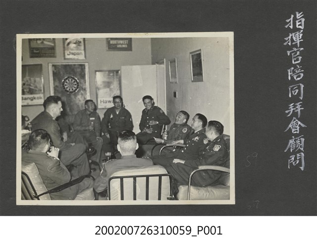 1.本物件以馬祖戰地為主題的照片,黑白樣式。照片為數位軍官一同圍在桌子旁,坐在沙發上討論的情景。照片可見拍攝地點為室內,牆上貼著許多英文海報、右側牆上則掛有兩面裱框,矮桌上則放有杯子。九位長官圍在桌子旁同坐,彭指揮官(右三)正在發言。照片左方可見一位外籍軍官。