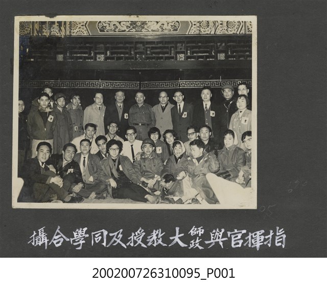 1.本物件以馬祖戰地為主題的照片,黑白樣式。照片為馬祖守備區彭啟超指揮官與教授、同學合影的情景。由照片可見拍攝地點為室內,室內裝潢皆為中式裝潢。照片內共有三十一人,大致呈現兩排。前排坐在地上者多為學生,男女參差排列。後排多為教授,彭指揮官(右七)站立於後排中央。
