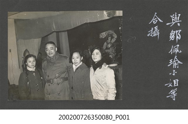 1.本物件為彭啟超指揮官與3名女子合攝之黑白照片,畫面中可見彭啟超指揮官身著長版風衣、繫有腰帶,身旁3名女子一起合影,最左側的綁了2根長辮子,右2則身著格紋外套,最右側的身著淺色夾克,此景位於室內空間,後方可見布簾。