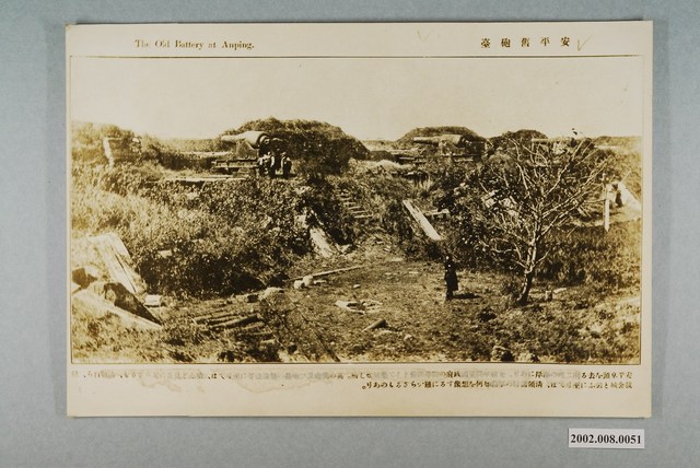 1. 本物件為以安平舊砲臺為主題之明信片。正面為安平砲臺內部之黑白照片,荒涼的地基沿著階梯可至最上方的炮臺,置放有三門大炮。地基、階梯、炮臺間雜草林木叢生。右下樹前及左上第一座炮台前有遊客。明信片上方印「安平舊砲台」、「The Old Battery at Anping.」,明信片下方印「安平阜頭を去る南二哩の海岸にあり。光緒年間清國政府の海岸防備として築城せし所。其の備砲及び砲壘の□選法等ニ至けては、□れと見るに足□□□も、□□自ら、億載金城とたふに至りでは、清領當時の軍□知何を想像すろに難ふらさるものあり。」大意為:離安平港南方海岸二哩處,光緒年間,清政府為海岸的防備而築城,其備砲及砲臺的築法幾無可看之處,清朝卻自詡為「億載金城」則不難想見當時的軍備情況。背面書有「安平舊砲臺內景」,四周有膠痕。2. 億載金城又稱二鯤鯓砲臺。西元1874年牡丹社事件後清廷派沈葆楨任福建巡臺使節,沈葆楨為了防範日本因此拆除熱蘭遮城,再以這些建材建造億載金城,最後於光緒二年(1876)完工,當時共有大砲5門、小砲4門並配置臺灣安平水師副將周振邦及300名兵士駐守,入口城門題字「億載金城」為沈葆楨落款。1895年日本領臺後在南部的劉永福軍也曾在此與日本軍接頭後向日軍投降。