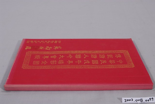 本物件為紅色外皮精裝本書籍,以燙金方式寫有書名《中華民國戊午年端節全國傳統詩詩人聯吟大會專輯》,此名為當時臺南市市長蘇南成所題,本書由臺南市安平區公所於戊午(1978)年蒲月(5月)編印發行。本物件保存狀態良好。