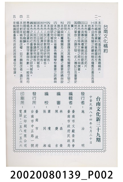 本物件為《臺南文化》重新發刊後第39期,故名新三十九期,臺南市政府發行,封面照片為潘麗水於臺南市西華堂門神作品。本期內容有「潘麗水與西華堂、對若干鄭成功征台史實的再探討、府城古蹟之我見、五十年來之台南基督教、台南文獻委員會日本史蹟勘考紀實」等題目。民國84年7月30日發行。