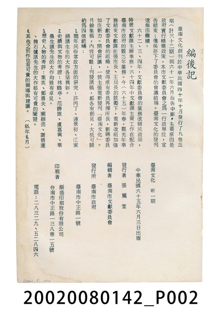 2002.008.0142 臺南市政府發行《臺南文化》新一期