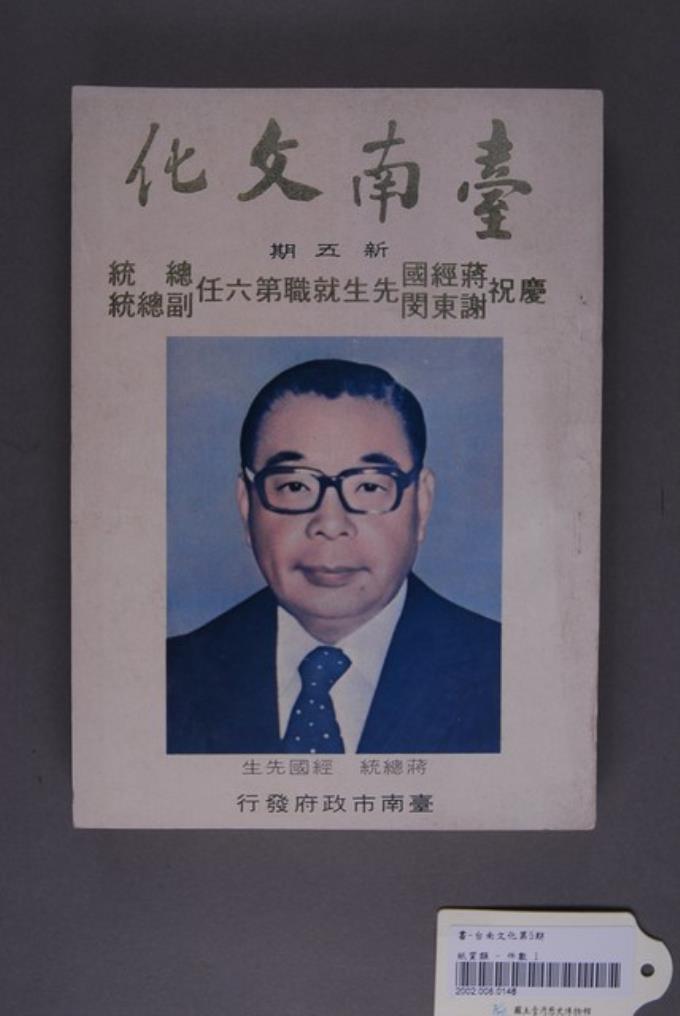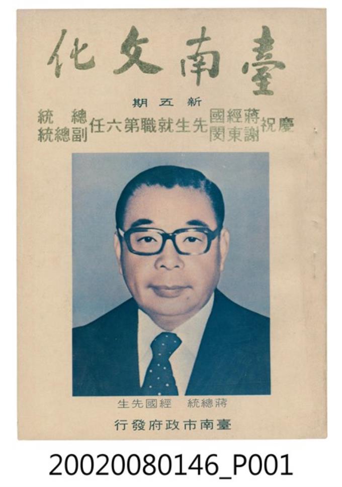 本物件為《臺南文化》重新發刊後第5期,故名新五期,臺南市政府發行,本期封面特註「慶祝蔣經國/謝閩東先生就職第六任總統/副總統」,封面照片為「蔣總統經國先生」照。本期內容有「明鄭時期的政制及文教措施、日據時期臺灣建制經緯、漫談台灣戲劇、從鹿耳春潮到鹿耳沈沙、國軍將士羅恩廣等五烈士簡介、林文賢領袖郡城商界」等題目。民國67年5月20日發行。