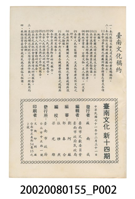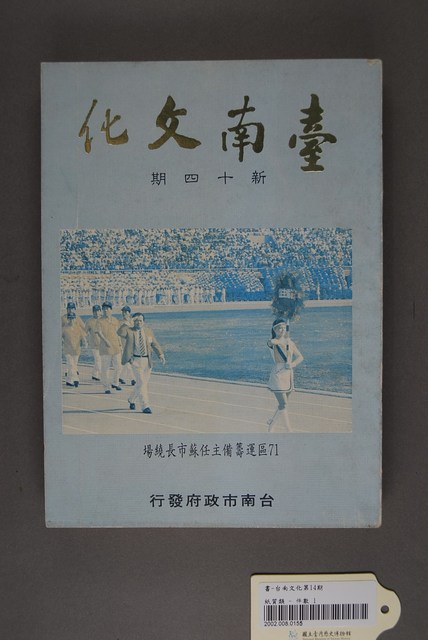 本物件為《臺南文化》重新發刊後第14期,故名新十四期,臺南市政府發行,封面照片為17區運籌備主任蘇市長繞場照。本期內容有「劉永福列傳、記台南古城巡禮、記台灣區運動大會盛況、中華民國千人美展、台南市區動物概況、台南市第一屆模範父親」等題目。民國71年12月31日發行。