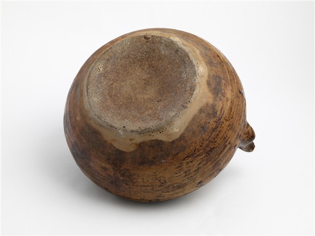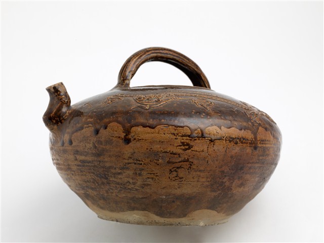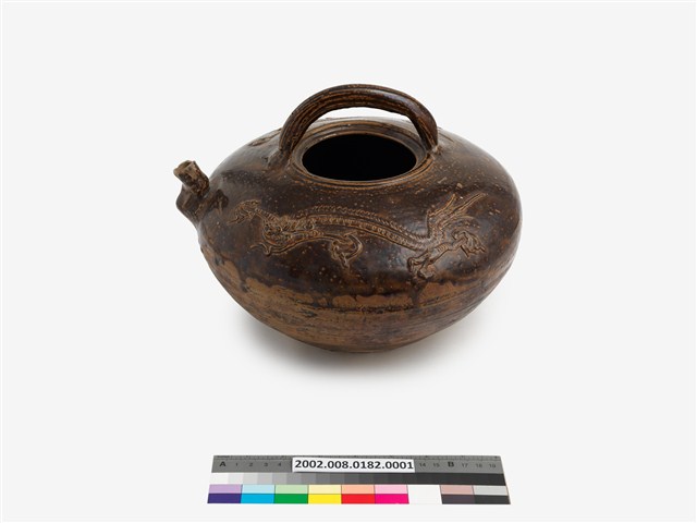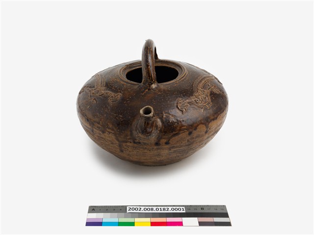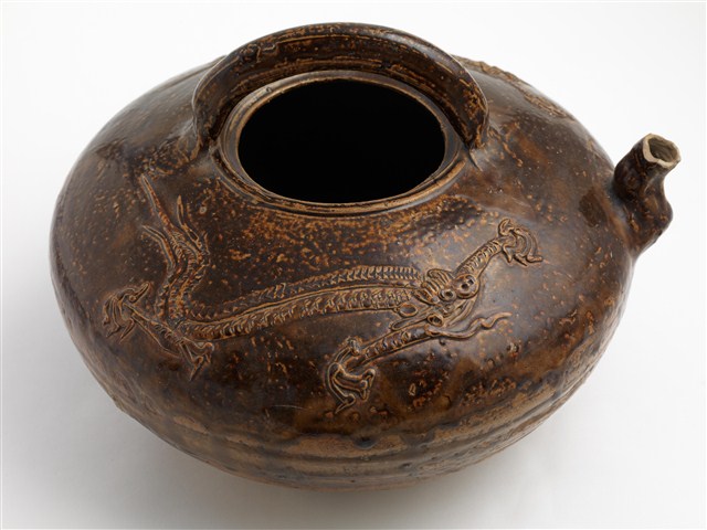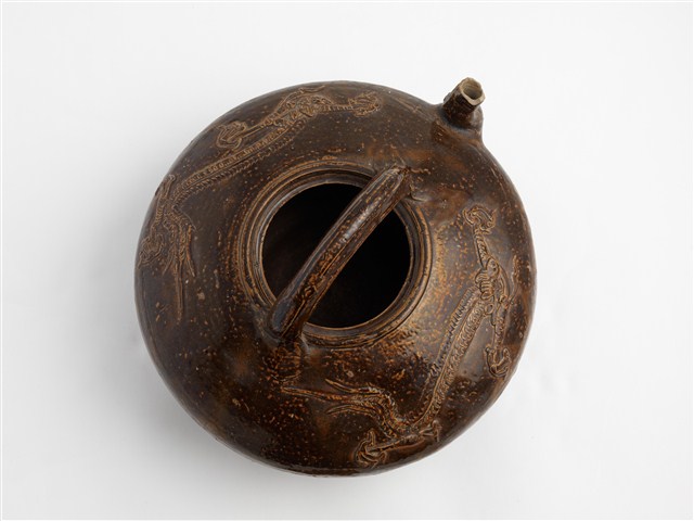 平口,壺身圓碩,流口斷裂,流身曲折帶稜,逾半緊貼壺身,提梁短厚呈半月形,兩側略見扁平帶稜,平底無足。胎質粗鬆,胎間略帶黑、黃細砂,致使器表凹凸不平,足底多沾黏而粗糙。器身僅施半釉,釉質與胎體燒結情形不佳,覆釉不均,肩部以下則任釉汁自然流淌,並見部分器表沾釉。器身肩部兩側龍紋採先貼塑、後雕刻的技法裝飾,線條刻劃簡略流暢,顯見雕工嫻熟。