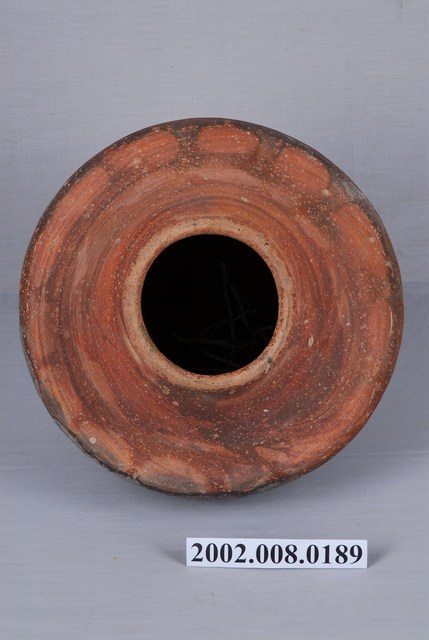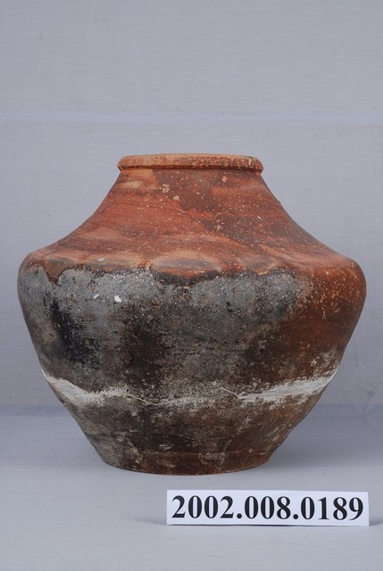 1. 紅陶素燒折肩甕圓口,圓唇,唇口下方略向內凹,頸部較長且線條外張,連接至器肩。口內壁可見弦紋的拉胚痕跡。全器最大徑在肩腹交接處,器身斜壁下收至圈足,平底,器底邊緣向內收,頗具圈足般的效果。全器手拉成形,唇口與腹部皆有不平整的痕跡,是手拉胚的特色之一,別具古樸風味。全器素燒無上釉,本件陶罐的胎色分佈不均,上半部較紅。器腹處則有因使用導致的焦黑痕跡。2.這類素燒陶罐因為沒有上釉作為液體的防漏層,功能多半用於燒煮,可以直接接觸火源加熱。