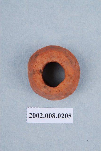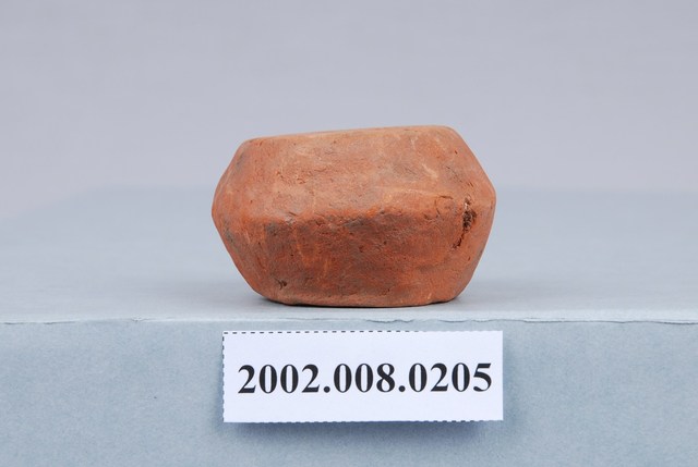 1.此物件為網墜的陶製沉子,為一中空圓珠狀磚紅色陶製品,沉子的表面有一處明顯的坑洞,圓珠內側也有若干裂痕。 2.網墜是繫於漁網下方使得漁網能下沉於水面之下的一種漁具,為了能沉於水下通常採用密度較高的物質製成,如石材、陶瓷、金屬等。