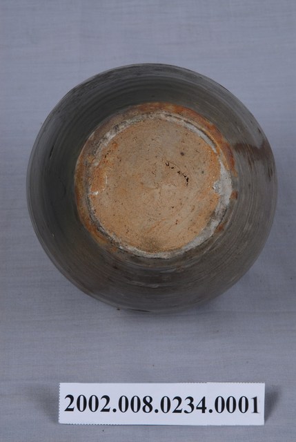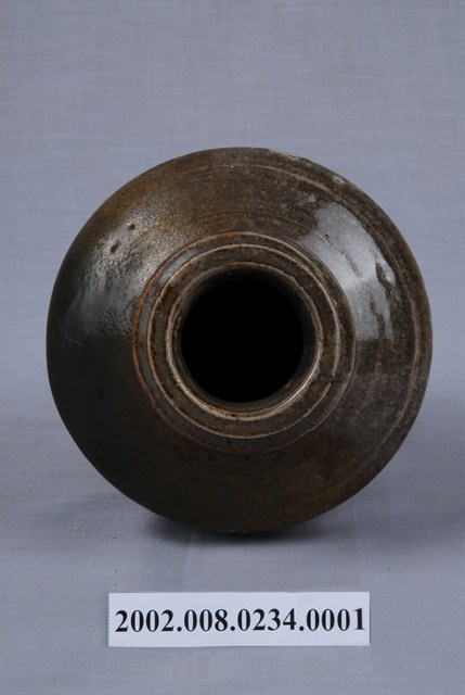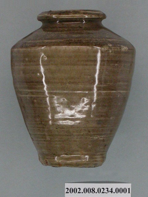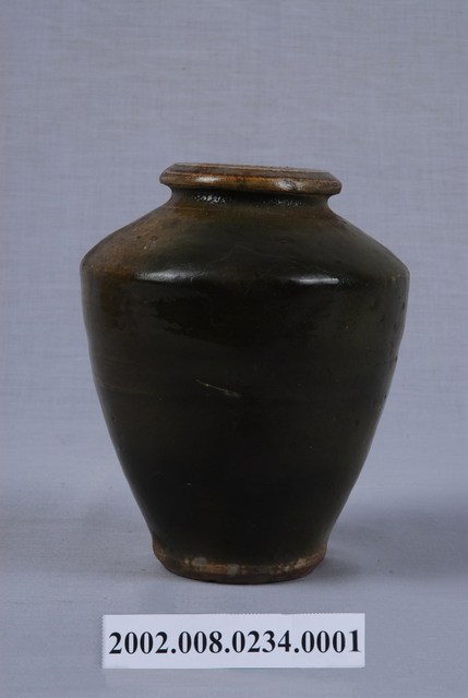 安平壺,平口,扁方唇,口部厚實,口徑略大,短頸,斜肩,器肩方折,器肩以下作弧形下收至器底,底部露胎,胎色略帶紅,底徑約略等同於口徑大小。薄胎,器內外施釉,釉色黑中帶黃,且施釉不均,器肩處有不少氣孔。安平壺較常見的是淡色釉的形式,以濃重的黑釉裝飾較少。