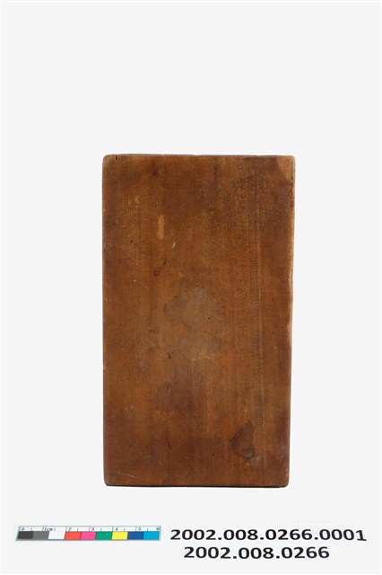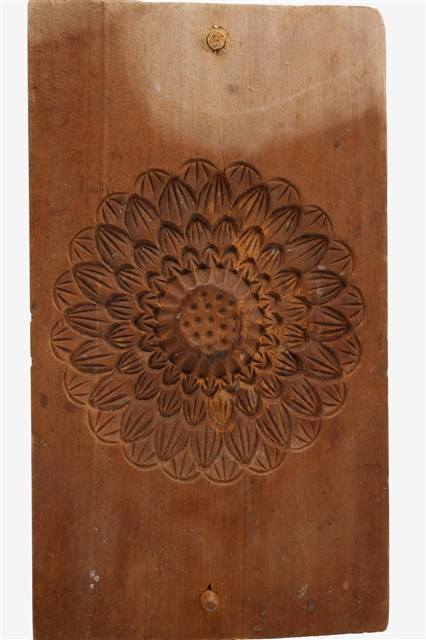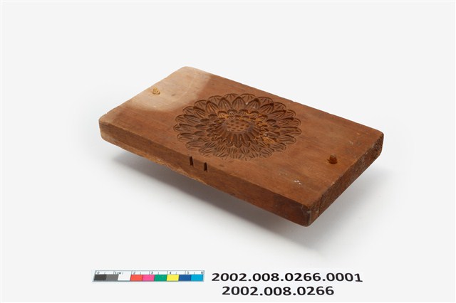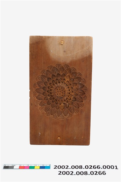 長方形木板,中央挖空一菊花花辦外形。本件為長方板單面雕單菊糕印之上方脫模蓋板,兩側各有一孔洞,其功能是在組合模具時套入凸鈕,以防滑移的作用。