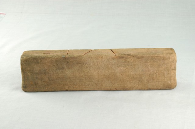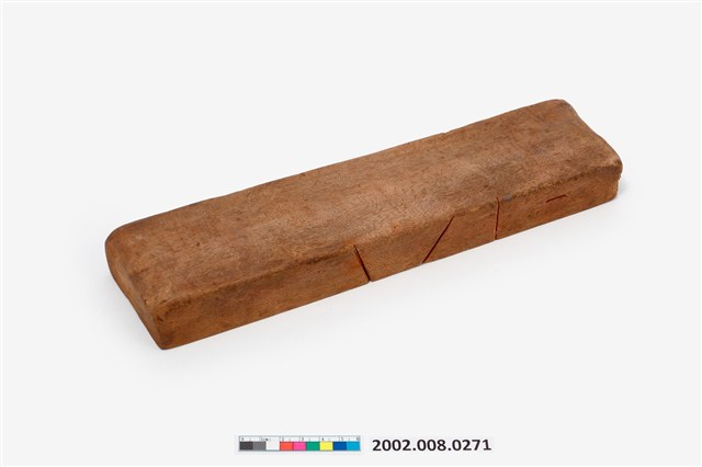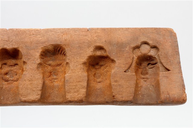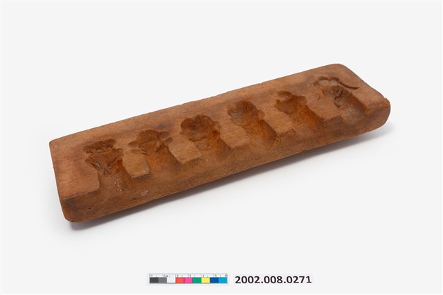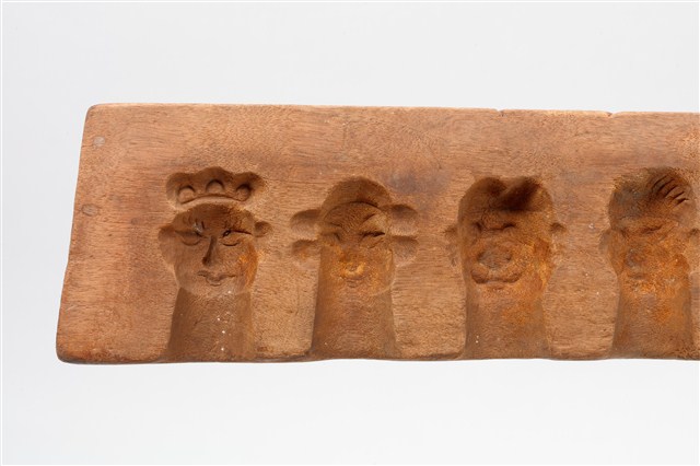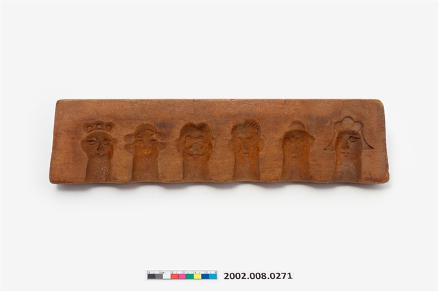 1. 長條板單面雕西遊記人物糖塔模子,外形呈長方形,印模內側雕有6個西遊記角色人物頭像,包括唐僧、孫悟空、豬八戒、沙悟淨、牛魔王等。側邊刻有國字「一」,以及數道刻痕,推測本件為糖塔模組配件之一,數字與刻痕應為避免拼合時錯置所設。西遊記人物糖塔應是祭祀時用以酬神的供品,相當於演戲酬神的作用。