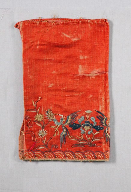 1. 此飾褲為單層結構,以大紅絲緞做底布,下端以五彩絲線刺繡喜鵲梅花、彩鳳牡丹以及菊花、水浪等紋飾,刺繡技法以盤金釘線、長直針、纏針、鋪針、紮針等針法構築繡面,褲口處以淺綠色絲線做三角結邊繡完成收邊。