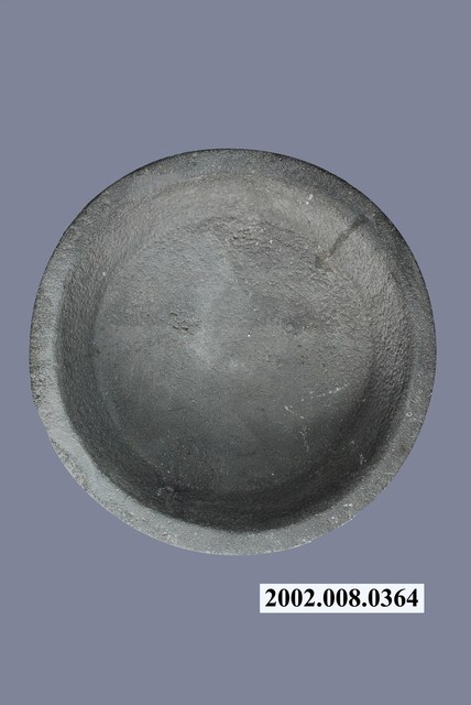 1.本件洗衣石盆以砂岩石塊一體成形製作,敞口,直壁,平底,器身上寬下窄,整體呈淺桶狀,器壁近底部鑿有一圓形孔洞。全器素面無紋,外觀呈灰色,盆外側下方有些許磚紅色,器表粗糙,可見石頭的顆粒紋路,口沿因使用摩擦顯得較為平滑。2.臺灣早期自來水與洗衣機尚未普及,洗衣服時需取用井水或河水,將衣服放在盆內以人力擣衣或搓洗。本件石盆側邊底部鑿有一個小孔,方便洗衣服時讓水流出。
