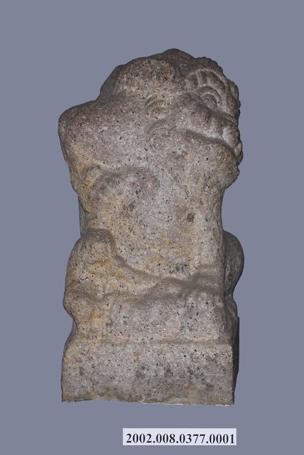 本文物為墓手石獅組的其中一件,為置於虎邊的母獅。本組石獅為運用於閩南式墳墓的守護神獸。置於墳墓前方的左右墓手立柱上,為裝飾性柱頭。上段為圓雕獅形,下方基座呈長方體以貼合立柱。成對放置,龍邊為公獅,虎邊為母獅帶小獅,公、母兩獅對望。石獅皆上身立起,傳統閩南式造型表情溫順,扁鼻高額,公獅前腳戲繡球或持綬帶,母獅抱小獅。日本時代開始,受日本獅影響,造型改變,表情重威猛,獅鼻高突,耳加大,公獅以銅錢取代繡球。本件石獅母獅抱小獅,無高額,耳伏貼,為清咸豐以後到日本時代初期,尚未受日本影響的造型。刻紋仍為手工雕造。