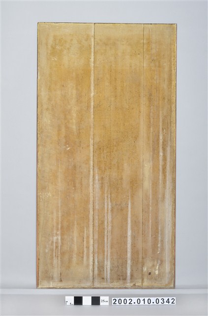 為敦本堂彩繪格板。格板是傳統建築板壁構件。板壁是木板拼接的隔間牆,通常用於廟宇或大宅的廳堂側牆。做法主要有兩種,一種是將支條隱藏於背面,正面平坦者,一種是露出支條為框,中置格板者。本件為後者做法之格板。本件格板由三片木板條組成,為直長形,正面彩繪二堂畫卷,繪有插入四季花梅、蘭的花瓶,題款各為「冰肌玉質對精廬承到十分帶月鋤 雪有精神須叚此生修得為誰□」、「一庭壽雨蘭孫秀滿地□□四季花 鹿溪 郭玉書 筆」,並落章朱色印二個。背面施黃彩。本件為身堵格板。與登錄號2002.010.0341、0343正反面彩漆色相同,可能同位於敦本堂正身右稍間板壁。