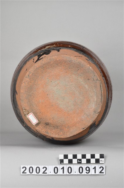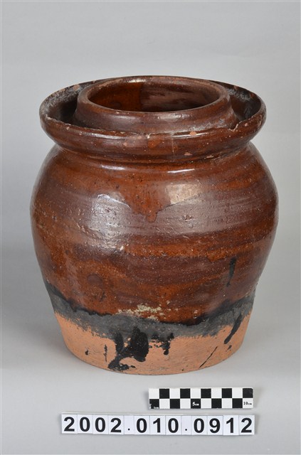 1. 醬釉豬油罐以紅土為胎,口部寬大,口徑略小於器身,口緣直立且高約兩公分,口沿多一道凹槽,用以放置清水以防螞蟻爬入罐中。短頸,器肩略寬,斜壁下斂至器底,器身呈圓長形。器身下部以及器底露胎,其餘部分皆上紅色釉,施釉不均且有流釉痕跡。2.此種罐型通常小於陶甕,用於裝鹽、油之類的家用品,因此也是十分普及的陶器之一。造型變化通常不大。
