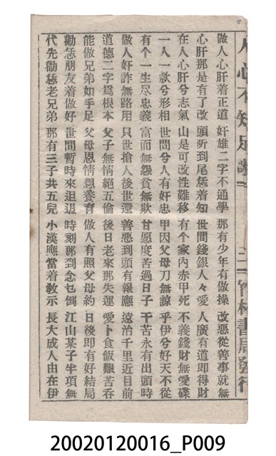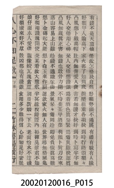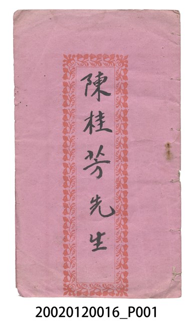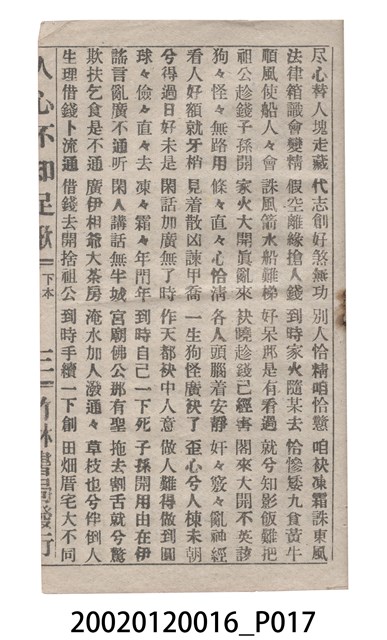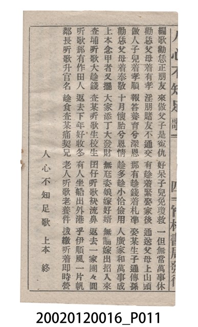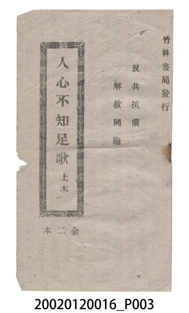 文物保存良好,值得一提的是封面和封底的顏色都是粉紅色,封面寫著陳桂芳先生,可能為文物擁有者,打開第一面是宴客的訊息,寫著:「蒙賀長男完婚 國農曆九月十八日星期四 敬備粗宴 恭候台光 曾思寬謹訂」。 內文則是《人心不知足歌》上本,全二本,竹林書局出版,書上第一頁寫著反共抗俄 解救同胞等字。但仔細看書中文字跟反共抗俄倒是沒有很大關係,大都是勸人要知足常樂,富貴險中求等語句。全文是七字一句四句成一行,一頁共十一行。 然而為什麼在書上第一頁寫著反共抗俄等字,原因是因為當時政府的政策如此。根據中國國民黨全球資訊網的資料:「反共抗俄為1950年-1960年中華民國政府在台澎金馬(自由地區)所施行的重要基本國策及政治宣傳。其中,共指共產黨、中國共產黨,俄則指蘇聯(蘇俄)。」