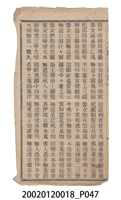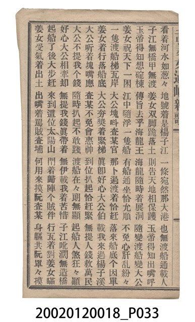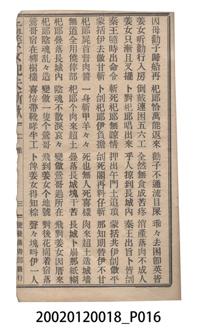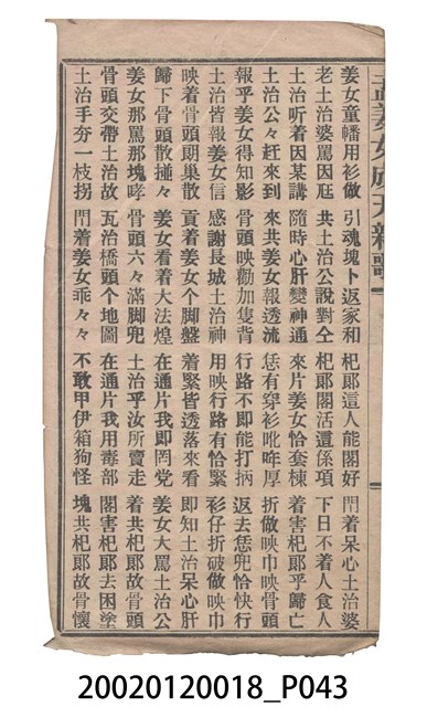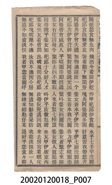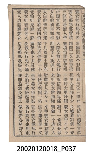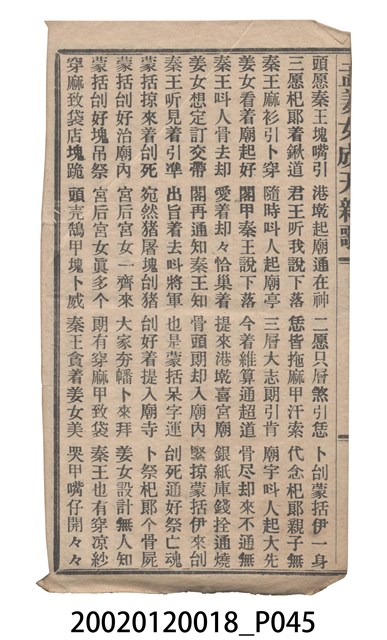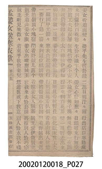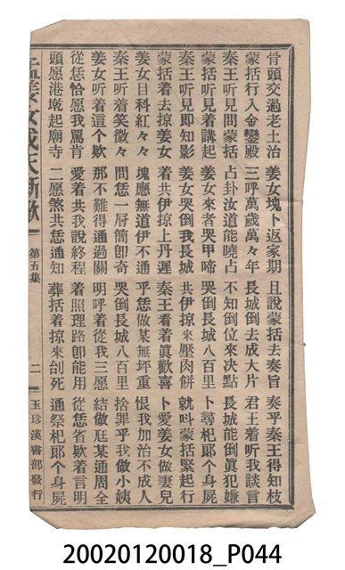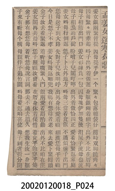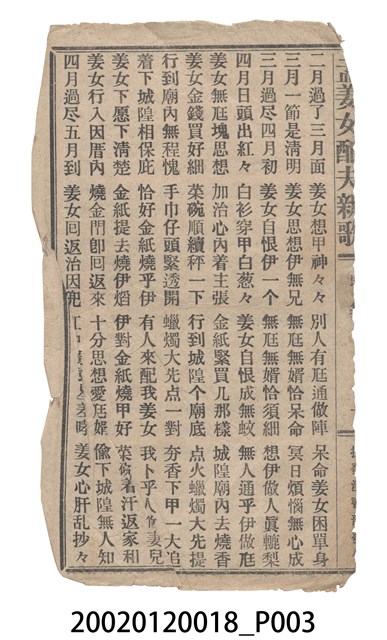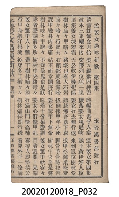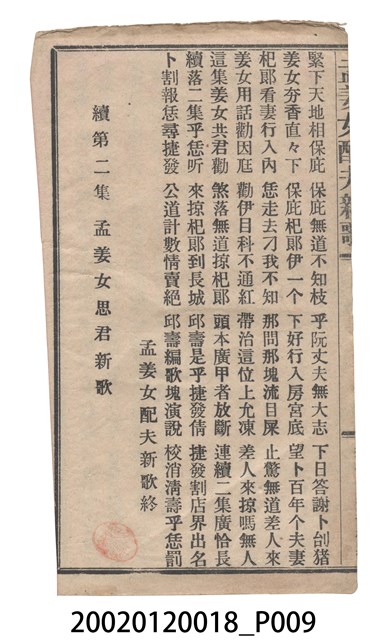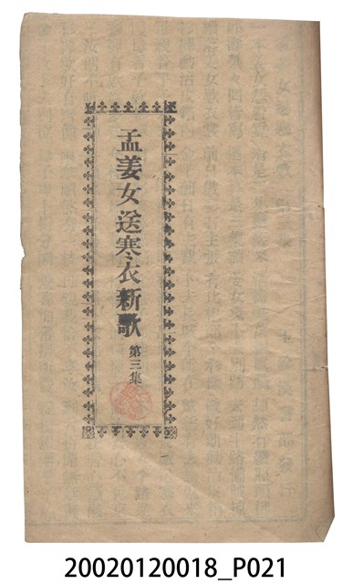 文物封皮表面老舊,有輕微破損,但是字體仍清晰。 在物件上沒有明顯標示年代,根據查閱相關檔案和資料庫,與此物件相同名稱,發行者相同,年代為昭和時期,因此以此來推測此物件的的年代應是與之相同。書寫形式仍是七字一句四句成一行,每頁共十一行,是頭集。孟姜女是民間歌謠與民間傳說故事。 此物件內容是在說孟姜女於元宵時節,期盼有個歸宿。到了四月,姜女至城隍廟許願,祈求好姻緣。六月和范杞郎相遇,孟姜女知道杞郎被抓去築長城的遭遇後,帶他回家,並盛宴款待。對於孟姜女的故事有很多相關傳說,後來還搬上舞台成為戲劇演出。然而「孟姜」,孟字應是為庶長子或庶長女,姜才是姓,是美女的象徵性稱呼。在《詩經》中多次出現,如《詩經·國風·鄭風·有女同車章》有句「彼美孟姜」。