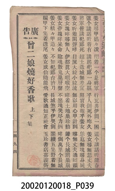 根據歌仔冊與唸歌 - 國立臺灣大學圖書館 數位典藏館 cdm.lib.ntu.edu.tw/cdm/landingpage/collection/kua-a-tsheh資料補充,推測應是昭和11年的文物