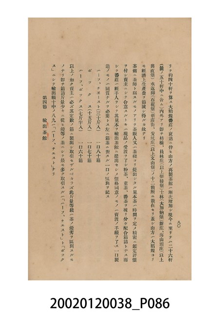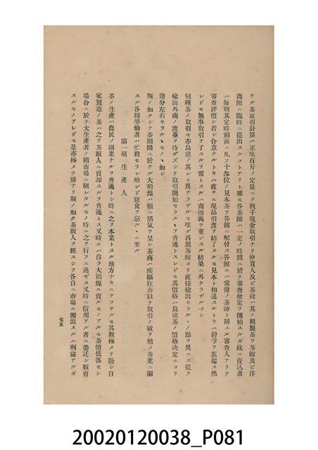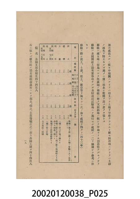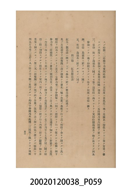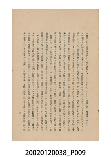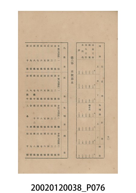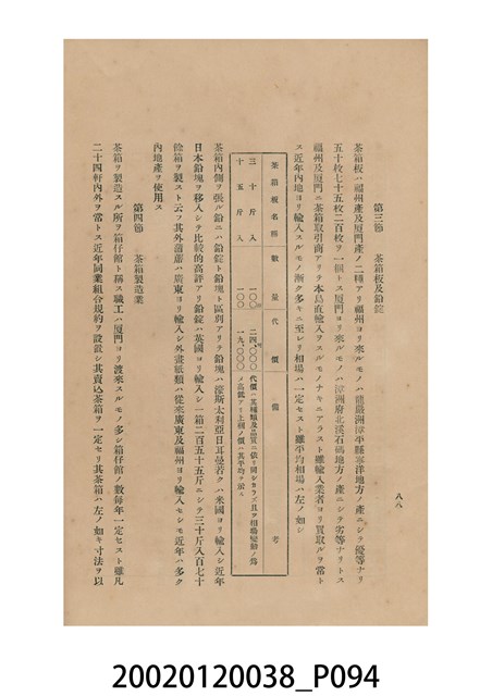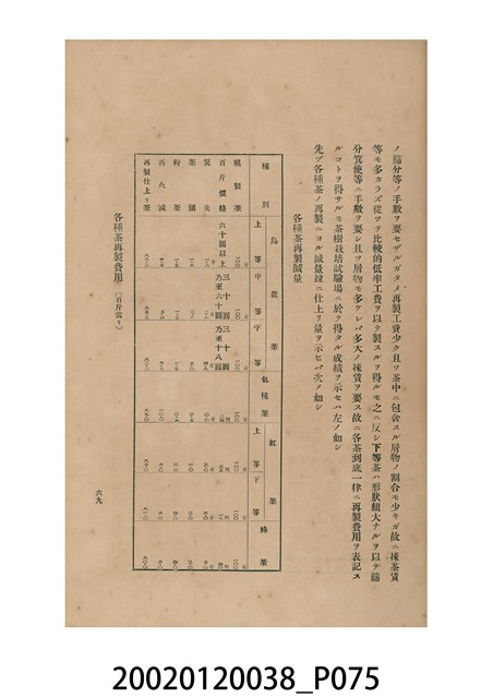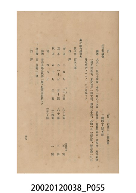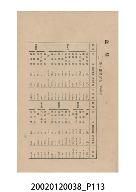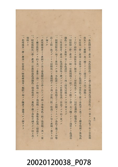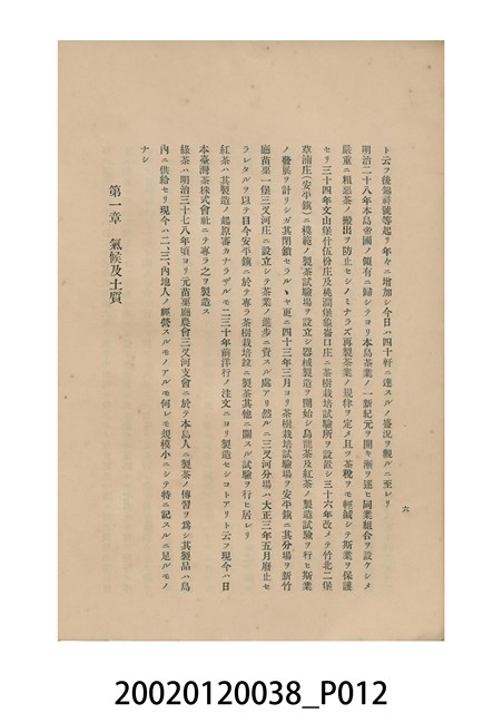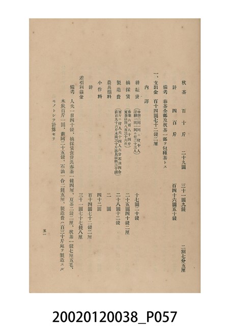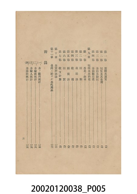1.本物件是臺灣總督府民政部殖產局於大正4年(1915)3月30日出版的《臺灣茶業一班》,印刷單位為位於臺北城內的小塚印刷工廠。該書大致上保存良好,內頁清楚,唯附著髒污與黃斑,整本書以日文書寫,並搭配數個相對應表格及些許圖表。