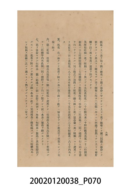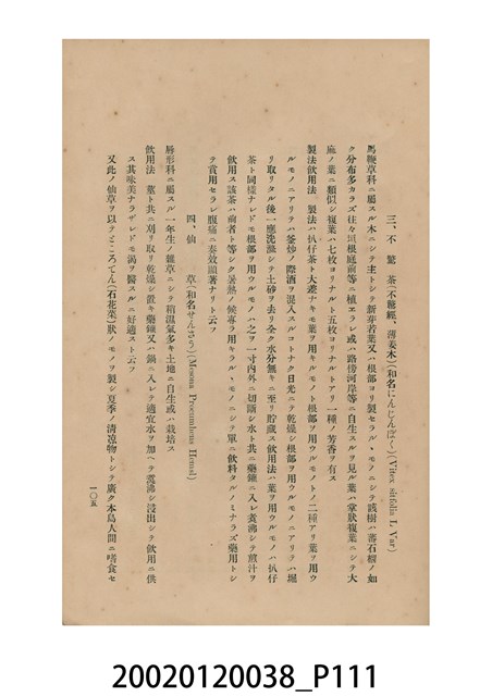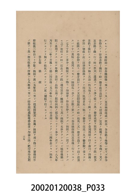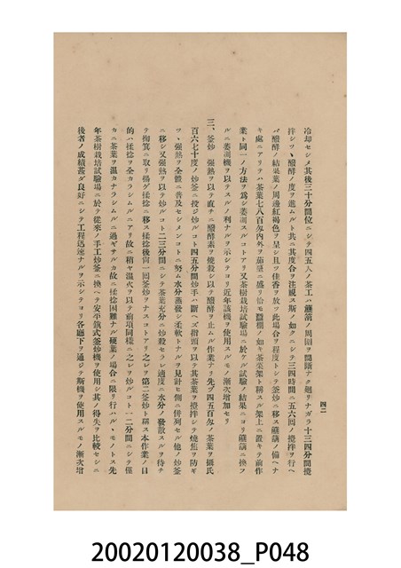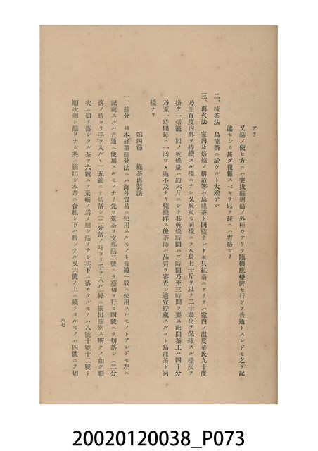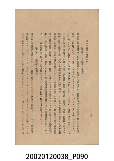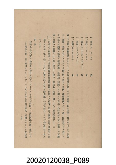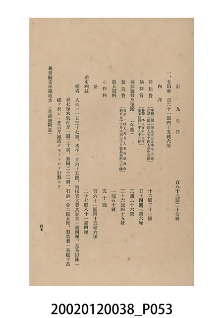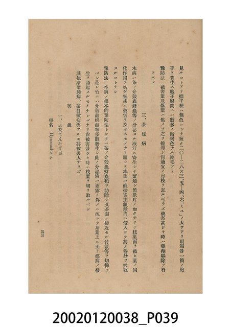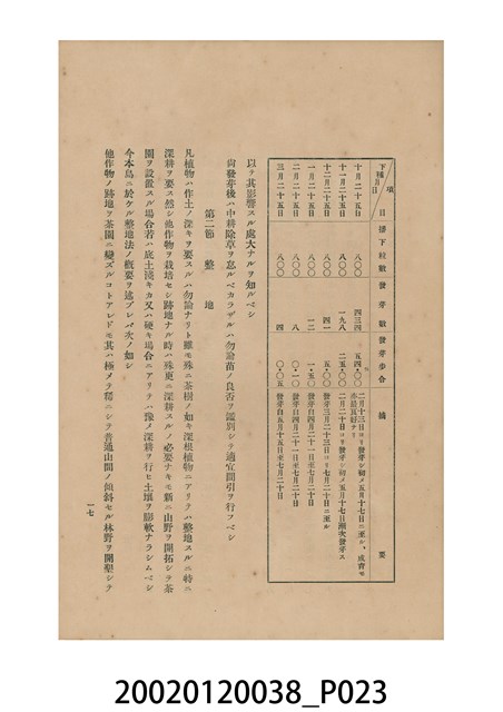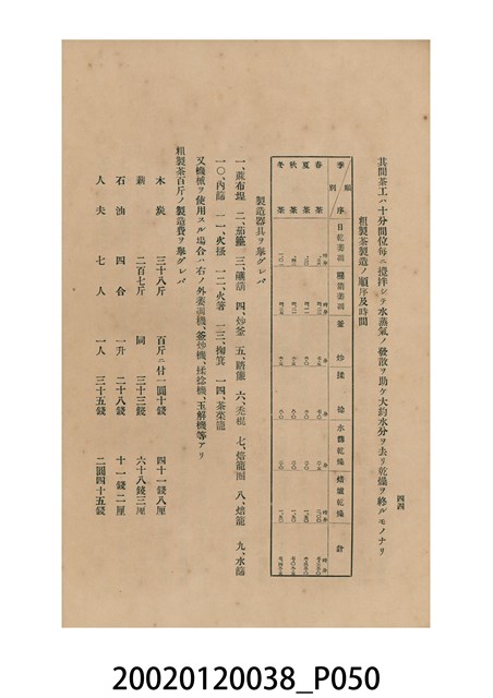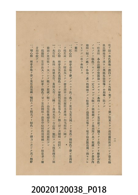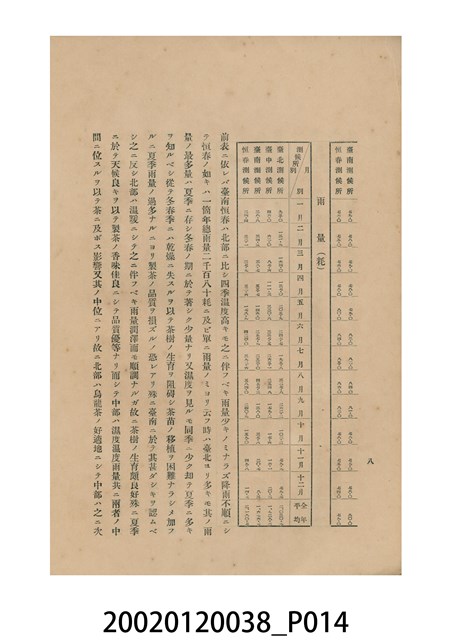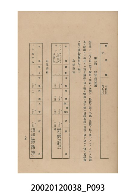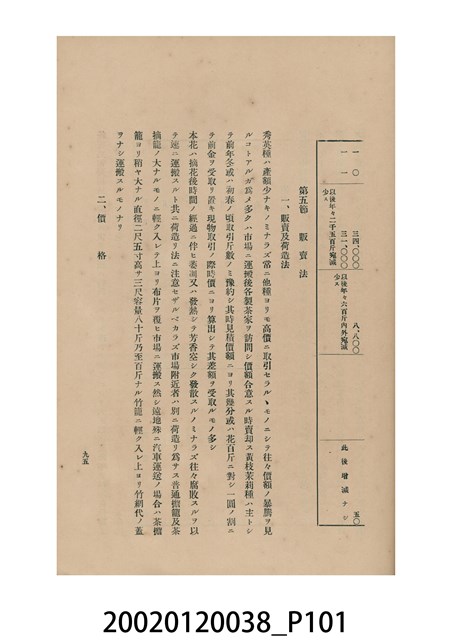 1.本物件是臺灣總督府民政部殖產局於大正4年(1915)3月30日出版的《臺灣茶業一班》,印刷單位為位於臺北城內的小塚印刷工廠。該書大致上保存良好,內頁清楚,唯附著髒污與黃斑,整本書以日文書寫,並搭配數個相對應表格及些許圖表。