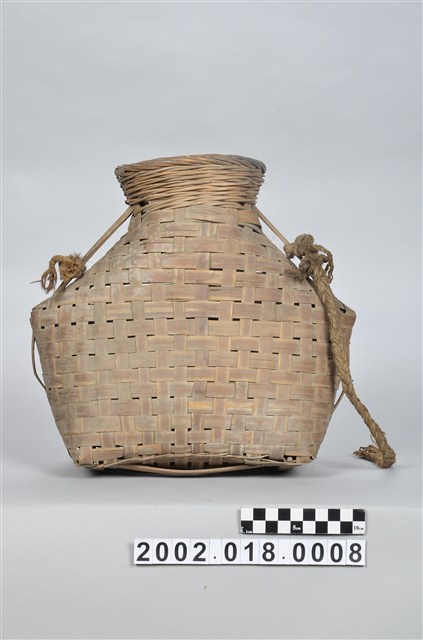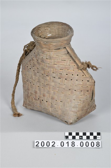 1.此物件為竹編魚籃,為一使用竹篾編織而成的捕魚用容器,此魚籃為開口小而瓶身寬的設計,魚籃的頸部繫有一麻繩。