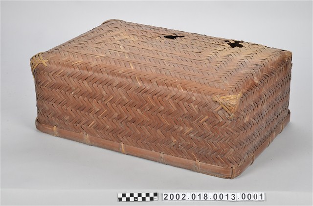 1.本藏品為方形竹籃,長68.3公分、寬45.6公分,高25.9公分,可以分為籃子的口緣以較粗的竹蔑固定,器身其餘部分以細竹片交叉編成,整體呈現方形,無上蓋。通體無其他裝飾,亦無上漆,給人做工繁密而樸實之感。